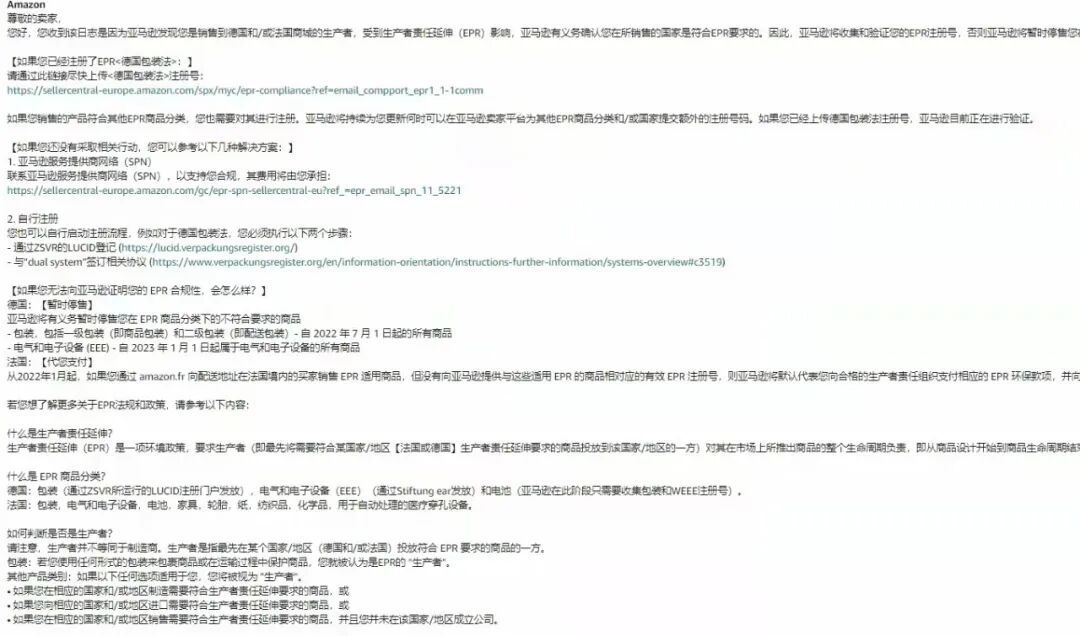 早在2021年,亚马逊就发布公告告知德国/法国卖家需在2022年上传EPR注册号,还以平台邮件方式发送给卖家提醒早日完成合规。