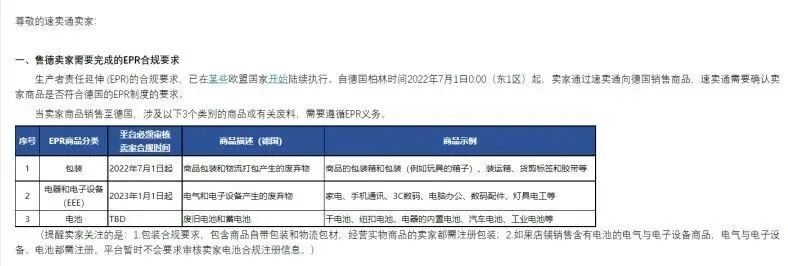 3月10日速卖通平台发布公告称,自2022年7月1日0:00(东一区)起(德国柏林时间),卖家通过速卖通向德国/法国销售商品,平台需要确认卖家商品是否符合德国/法国的EPR制度要求。