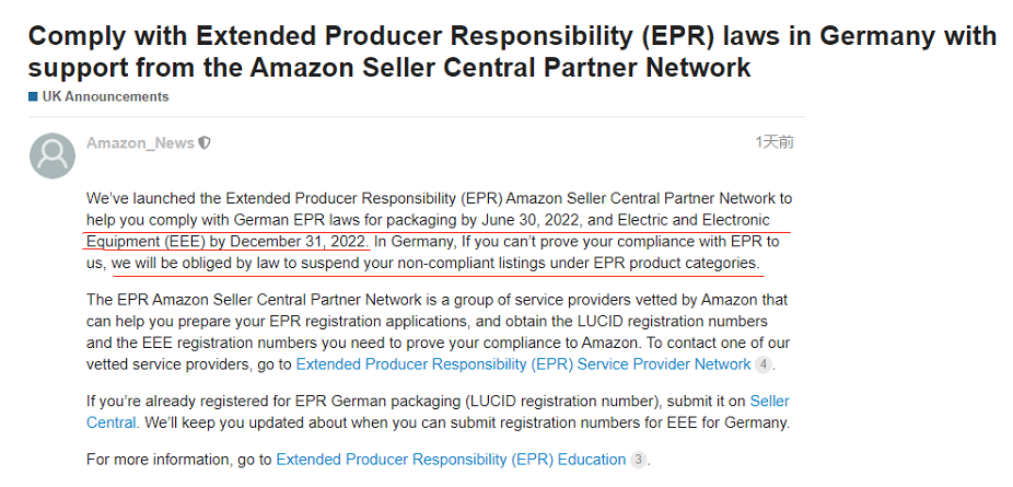 3月21日,亚马逊在欧洲站再发新公告:在亚马逊卖家中心合作伙伴网络的支持下,遵守德国|/国的延伸生产者责任EPR法律的相关要求。